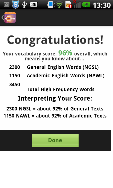 The test predicts not only your vocabulary level but suggests how many words from the NGSL and NAWL you know.