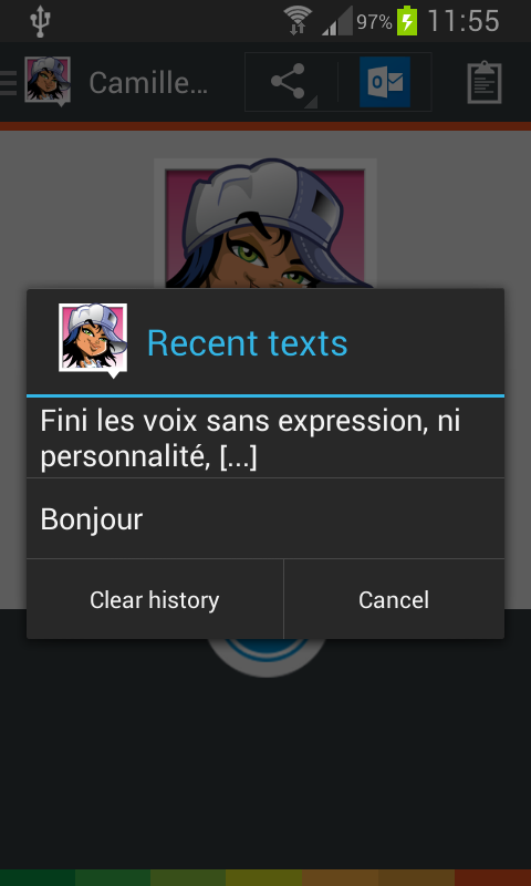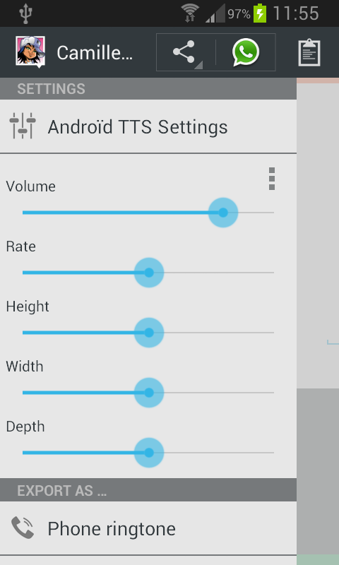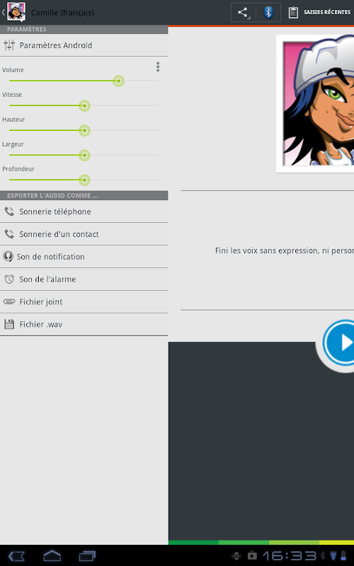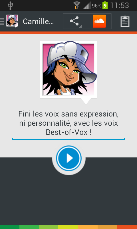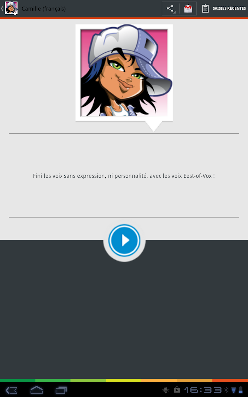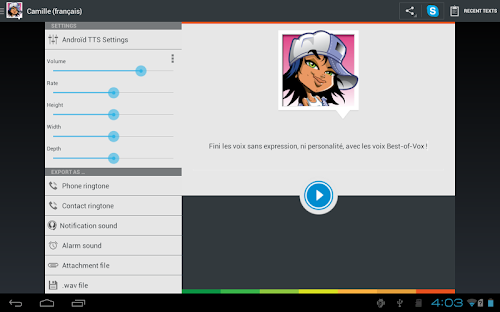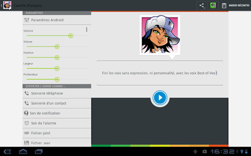 The Best-of-Vox application allows you to type or paste text and to have it read out aloud by the voice that you have chosen. You can then save it as a ringtone or share it with your friends on SoundCloud !