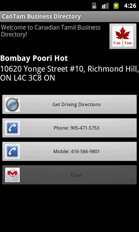 Canadian Tamil Business Directory: An Android application to search and find Canadian Tamil Businesses in Toronto, Ontario and Montreal Quebec in Canada. Rather than carrying a business directory, you can find what you are looking for from your phone and dial them by one click. In addition, this app provides driving directions.