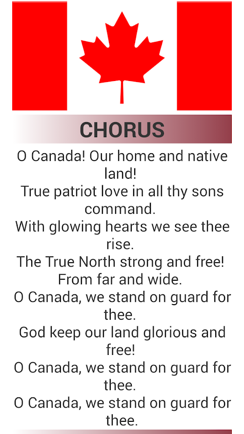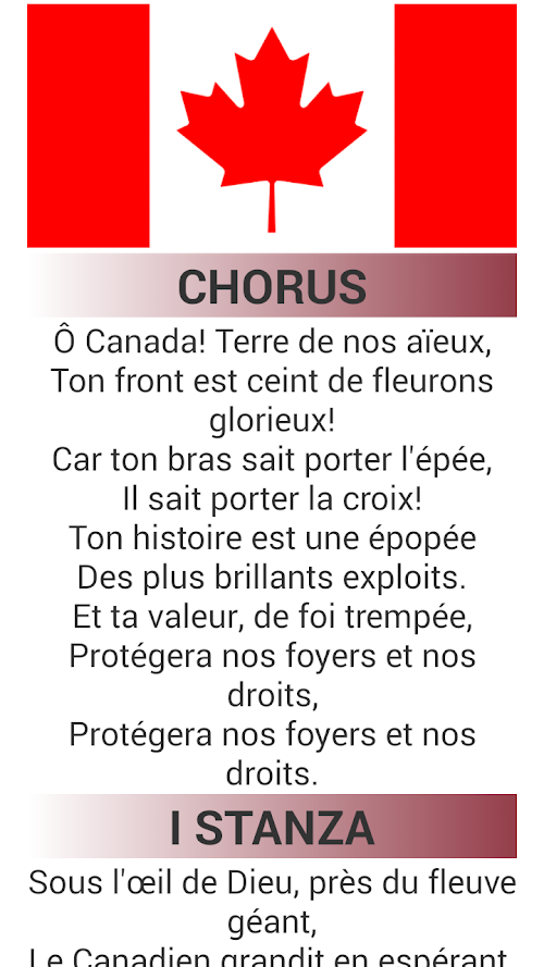 This app shows the lyrics of the national anthem of Canada in both official languages: english and french.