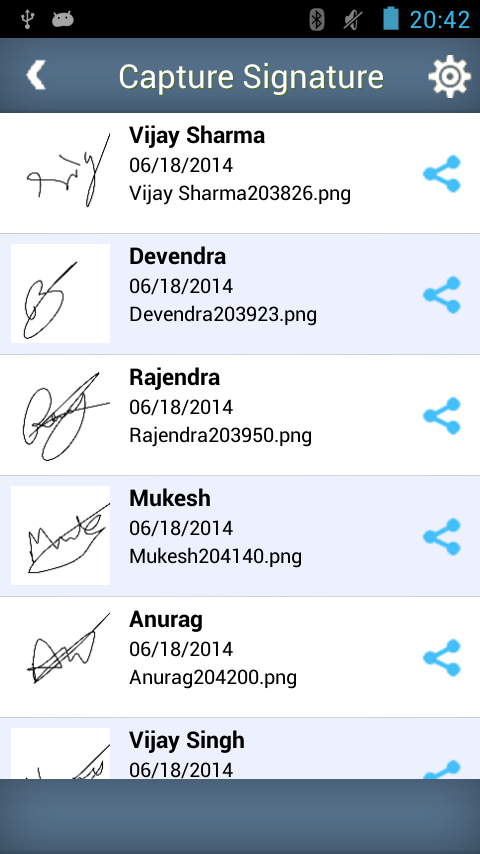 Clicking on Share Signature will show the list of all the signatures saved in the device.