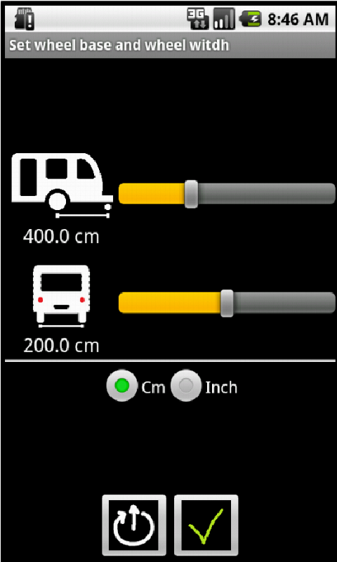 The app shows the amount of centimeters each wheel has to rise, taking the wheel base and the wheel width into account. Values for wheelbase and wheel width can be set according to your vehicle's measures.