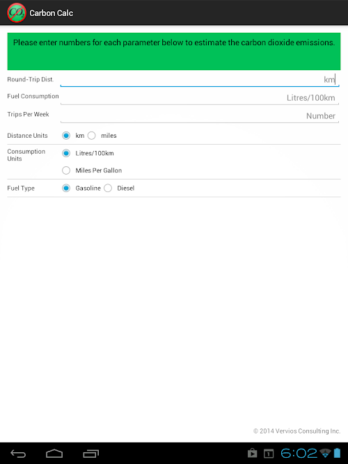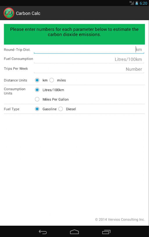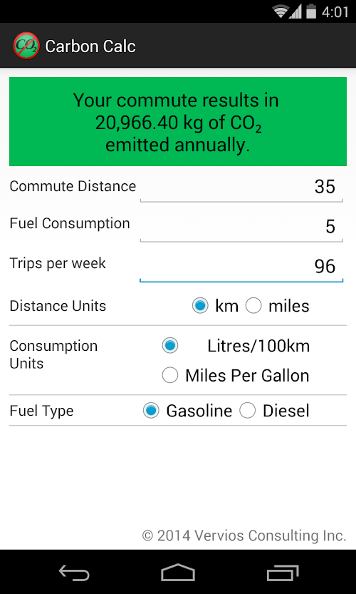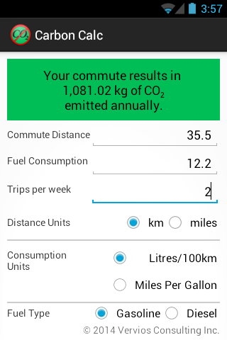 Vervios Carbon Calc is a simple, easy-to-use application that allows you to estimate your annual carbon dioxide emission resulting from your automobile travel. It allows you to enter your round-trip commute distance, vehicle's fuel consumption and the number of trips made each week so as to calculate your 'Carbon Footprint'.
