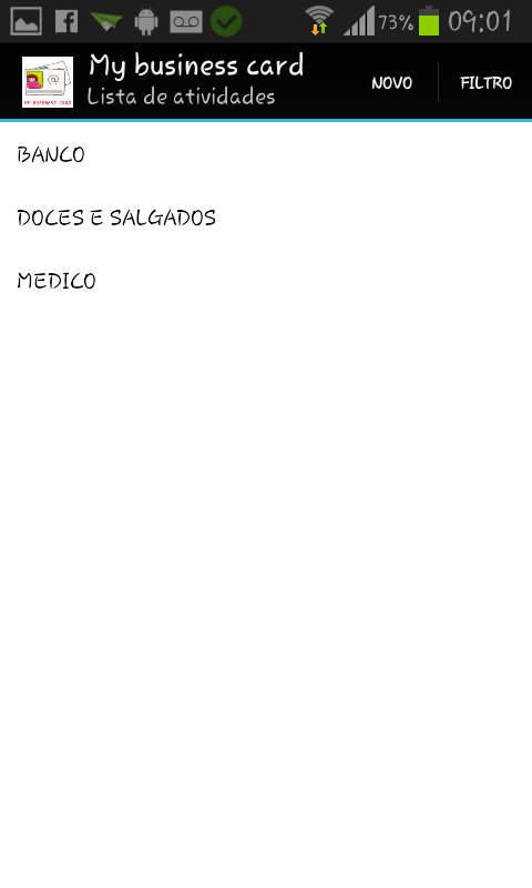 - Seus cartões gravados são apresentados em forma de lista, separados por letra, podendo pesquisar por nome, sobrenome ou ramo de atividade.