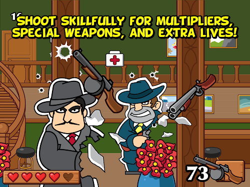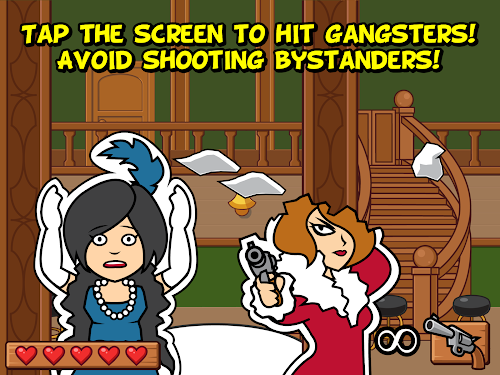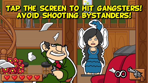 Tap the screen to shoot those silk-hatted hoodlums. Hit the target center on to bump off the villain immediately. Pick up special firearms from some thugs by hitting their weapon. Cardboard Crooks love their hats. Shooting it off will make them come after you harder.