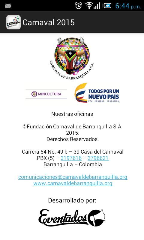 Para mayor información: desarrollo@eventados.comThis is the OFFICIAL application of Barranquilla Carnival 2015, which lets you enjoy the best carnival in the world.
