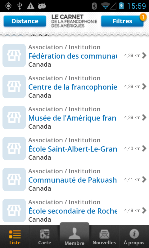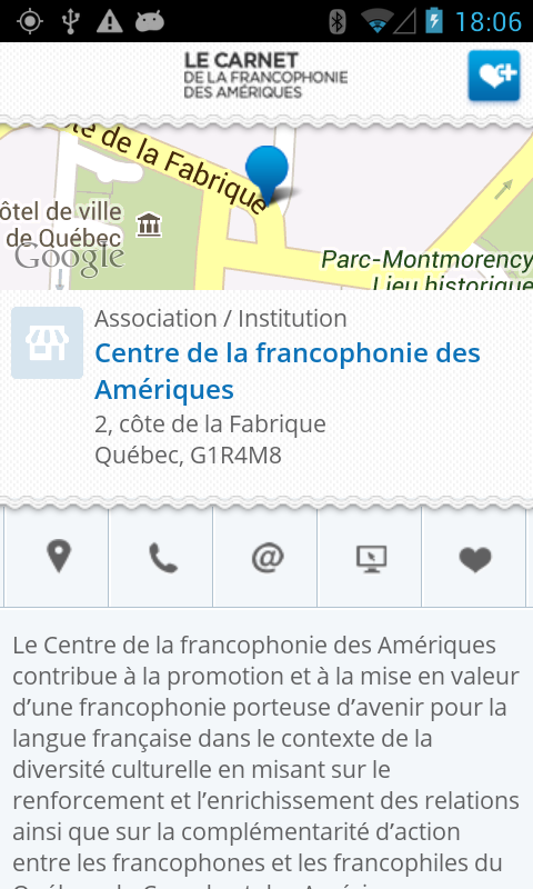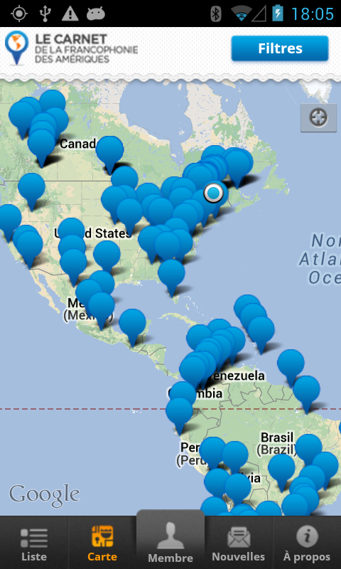 An initiative of the Francophone Centre of the Americas (Central), the application "Carnet de la Francophonie in the Americas" is a tool that lists Francophone organizations (institutional settings, school and community, associations, businesses, etc..) Everywhere throughout the Americas.