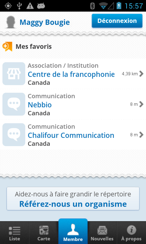 L’application « Carnet de la francophonie des Amériques » a été conçue afin de mieux faire connaître les organismes offrant des services en français dans les Amériques. Elle permet aux membres de la communauté francophone de partager et d’échanger. Aidez-nous à construire ce répertoire francophone en inscrivant ou référant un organisme, faisant ainsi du Carnet un outil de rayonnement de la francophonie des Amériques!"The Francophonie everywhere in hand!"