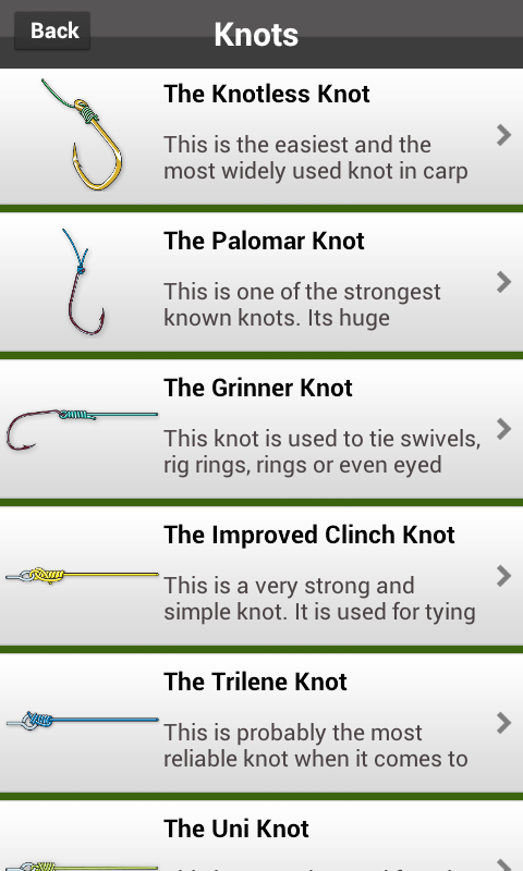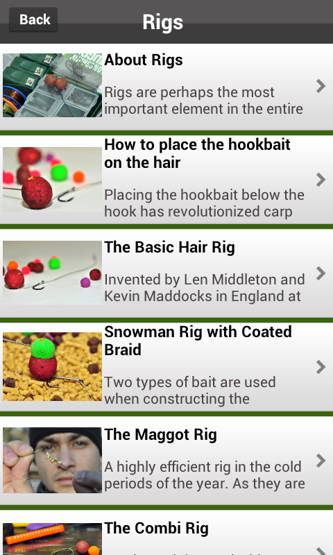 The app covers all important aspects of carp fishing: rig construction and applicability, knots, hook patterns, lead systems, baits and hookbaits, rods and reels, fishing lines, accessories, rod pods and bite alarms, bivvies (tents) and beds, mats and sacks, baiting and fishing techniques, tips and tricks etc.