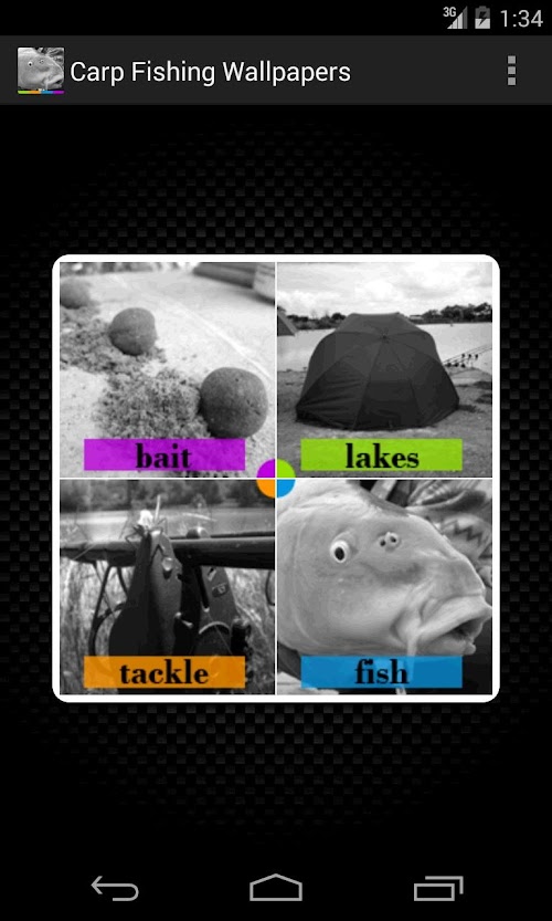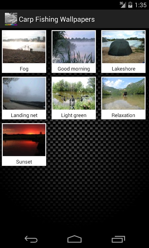In the app you can find four categories of wallpapers (at the moment): fish (moments from vicinity),lakes (with beautiful details), tackle (on the bank) and bait presentations.