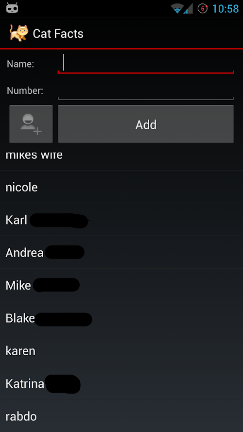 READ_CONTACTS this is so Cat Facts can help you easily locate a contact and add him as someone you want to send cat facts too.