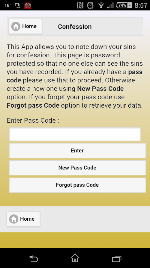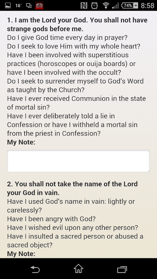 Version 2: In this version we have added functionality to note down your sins while examining your conscience. We have also added security to the Examination of Conscience page, so that the sins you have recorded in Examination of Conscience page cannot be seen by others.