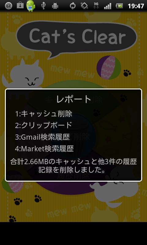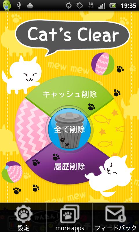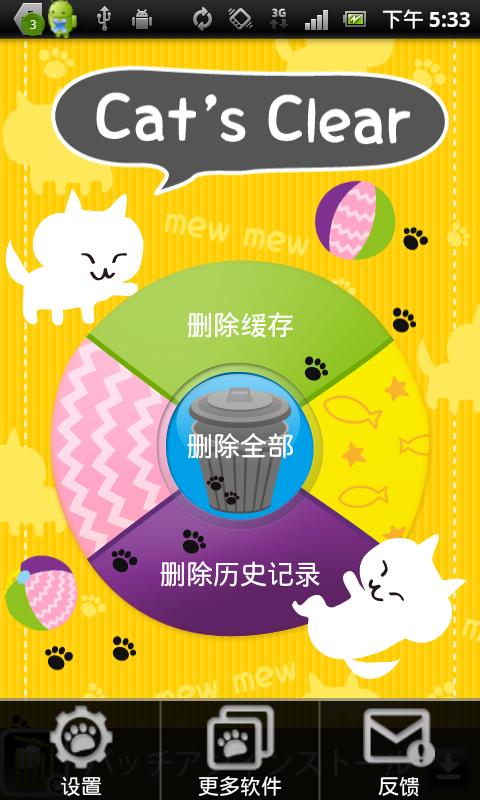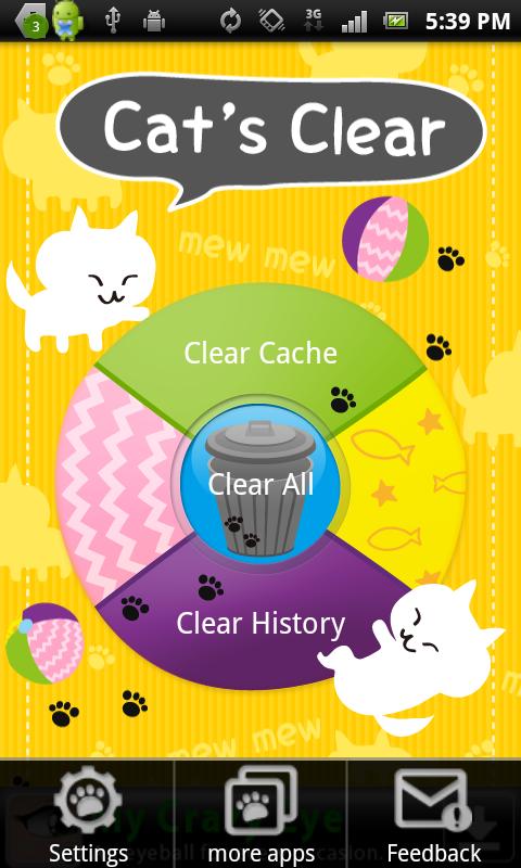 ""Cat's Clear"" is a fast clearing tool which can help you clean up cache and traces. After cleaning up these data, you phone system will be effectively optimized, so it runs more efficiently!