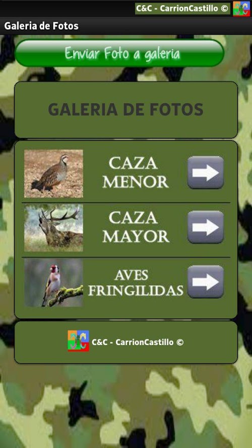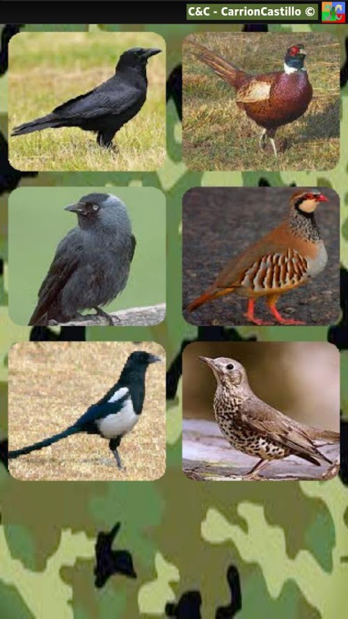 - Small Game Hunting: BIRDS -> Call of Common Pochard, Call of Red Partridge, Call of Quail, Call of Lapwing, Call of Dove, Call of Beast, Call of Starling, Call of Red and Common Thrush, Call of Frilled Mallard, Call of Common Teal, Call of Snipe, Call of Crow, Call of Common Coot, Call of Mallard, Call of Wigeon, Call of Call of Goose Common, Red duck, Shoveler, Call of Yellow-legged gull, Call of Black-headed gull, Call of Common turtledove, Call of Pheasant, Jackdaw, Call of Magpie, Call of Thrush charlo.