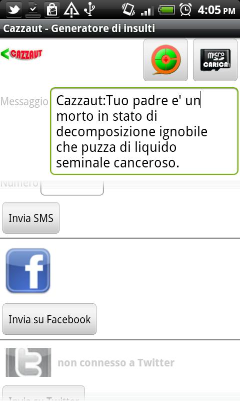 salvati o inviati via sms.Dalla versione 1.3 e' possibile postare su facebook e Twitter direttamente dall'applicazione. Inoltre, tramite copia e incolla si possono portare le frasi generate su altre app come Whatsapp.