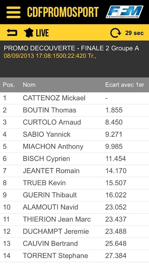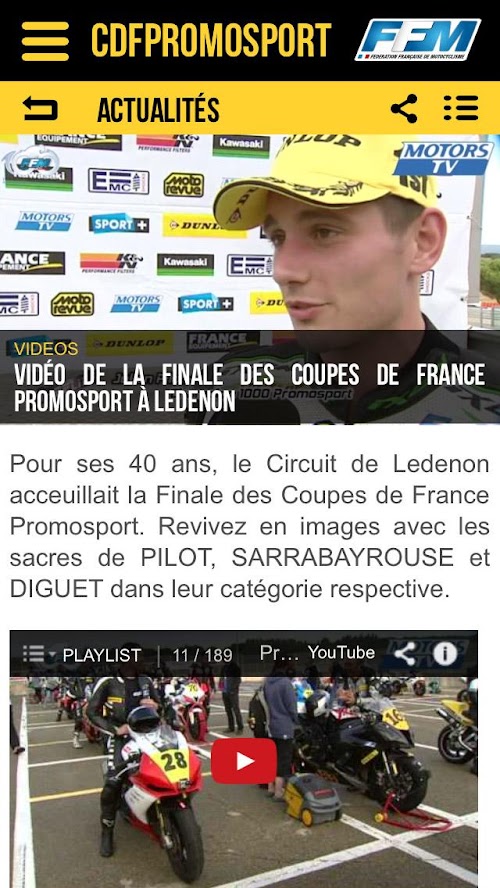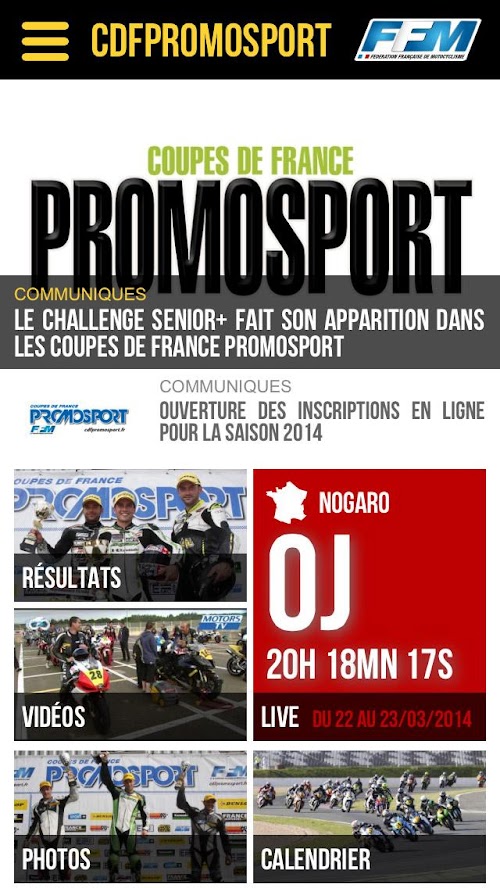 Téléchargez gratuitement l'application officielle des Coupes de France Promosport F.F.M. Retrouvez tous les résultats, le live, les photos et les dernières informations sur le championnat de France de motocross F.F.M.Get the official app Cups of France Promosport FFM Find all the results, live, photos and latest information on Motocross Championship France FFM