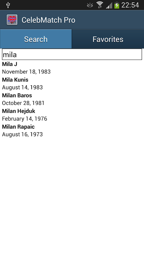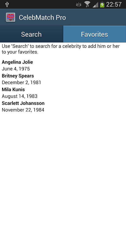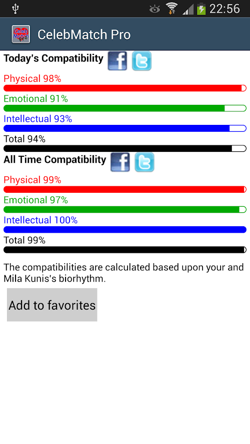 Always wanted to know how well you match with your favorite celebrity? Now you have the chance the find out! Do you have a crush on e.g. Mila Kunis or Brad Pitt? See your physical, emotional, and intellectual compatibility and discover if the both of you are a match. You can see your compatibility for today and the all time compatibility. CelebMatch Pro has a huge selection of celebrities so you'll always find your favorite celebrities and doesn't contain ads.