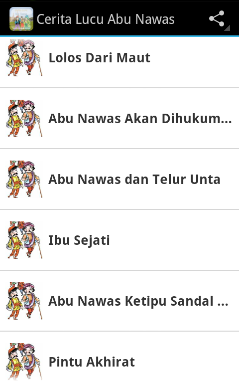 Cerita Lucu Abu Nawas adalah aplikasi gratis yang berisi kumpulan berbagai humor kisah Abu Nawas yang tentunya sangat lucu dan menarik. Cerita Abu Nawas ini dapat Anda gunakan sebagai hiburan di waktu senggang :)