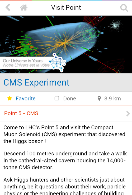 The CERN Open Days app is the ideal companion during these incredible days. Use this app to find out about all practical information, interesting visit points, possible parking or the places where you can grab some food or drinks. With an accurate map you will never get lost. The mission of the app is to help you to find all the information that you need and fully enjoy your time at CERN.