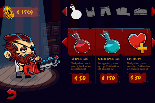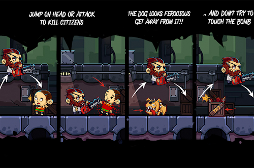 After drinking the new potion from experiment, our mad scientist cannot control himself and start killing everyone he met. Your mission is to help the mad scientist kill as much people as possible. But beware of the ferocious angry dogs and the bombs, dangerous acid hole because they may defeat our main character.