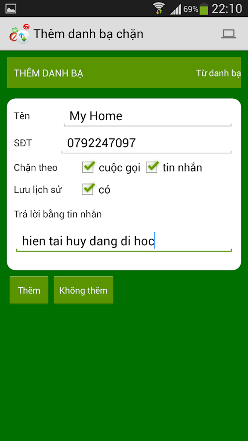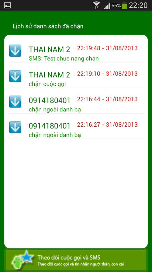 Chan cuoc goi | Là một ứng dụng thuần việt cực kỳ nhẹ dành cho điện thoại Android. Hiện tại chức năng chặn cuộc goi và tin nhắn chỉ có mặt trên các ứng dụng nước ngoài: diệt virut... nhưng đa phần đều là những ứng dụng có phí (hoặc hack mới có thể dùng được). Vậy tại sao mọi người không dùng thử ứng dụng hoàn toàn miển phí, giao điện thân thiện - trực quan và thuần việt: "Chặn cuộc gọi và SMS"