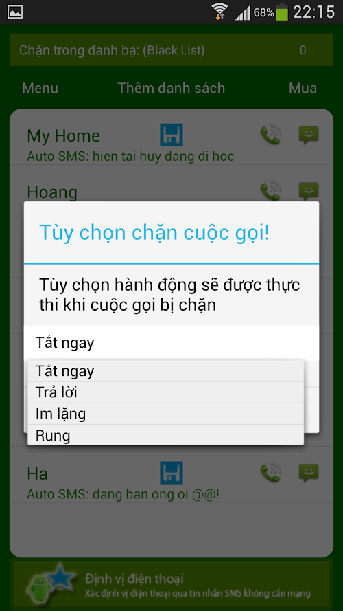 - Tùy chọn khi cuộc gọi chặn: trả lời, tắt ngay, im lặng, rung...