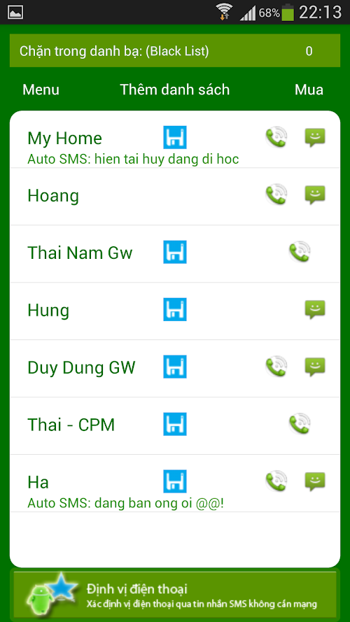 - Tự động trả lời tin nhắn (Auto SMS) theo từng danh bạ khi có tin nhắn hay cuộc gọi đến (người dùng tự cấu hình)