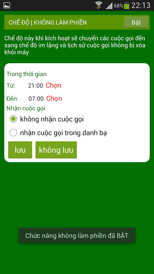 - Chế độ KHÔNG LÀM PHIỀN tự động từ chối cuộc gọi trong khoảng thời gian cấu hình trước