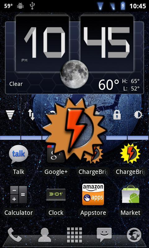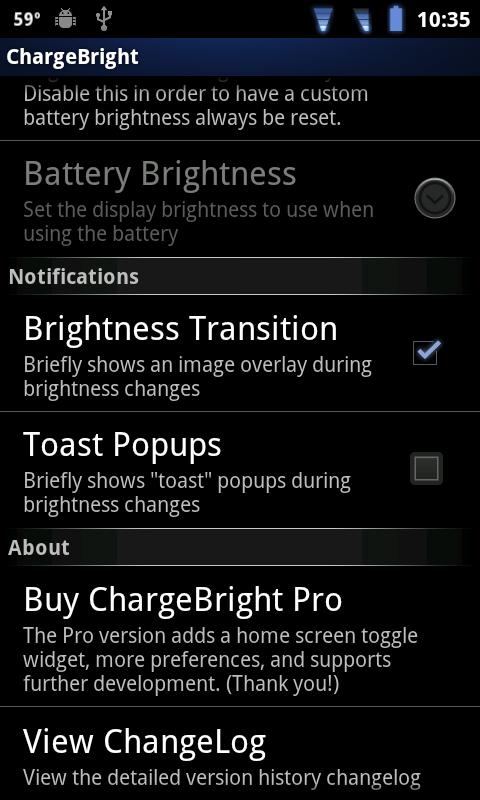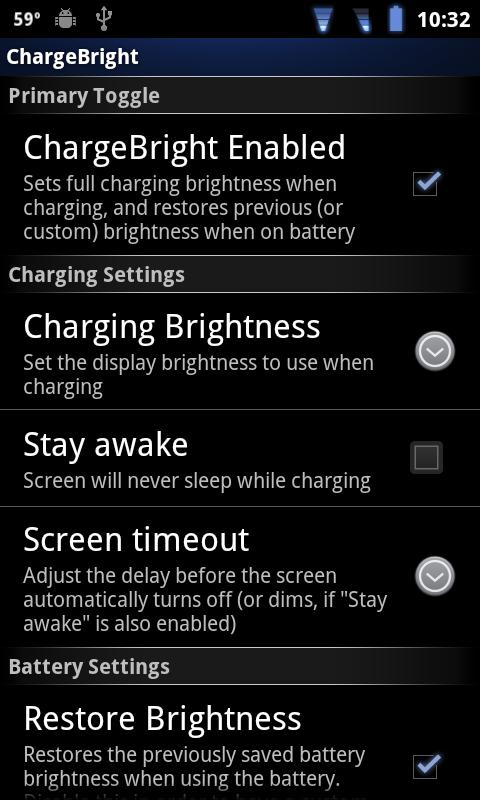 ChargeBright automatically increases your display brightness when charging, and automatically restores your lower default battery brightness when not charging.