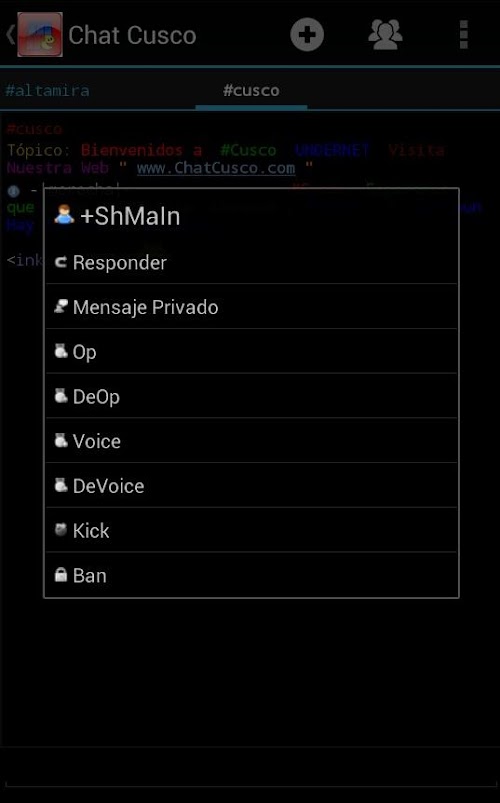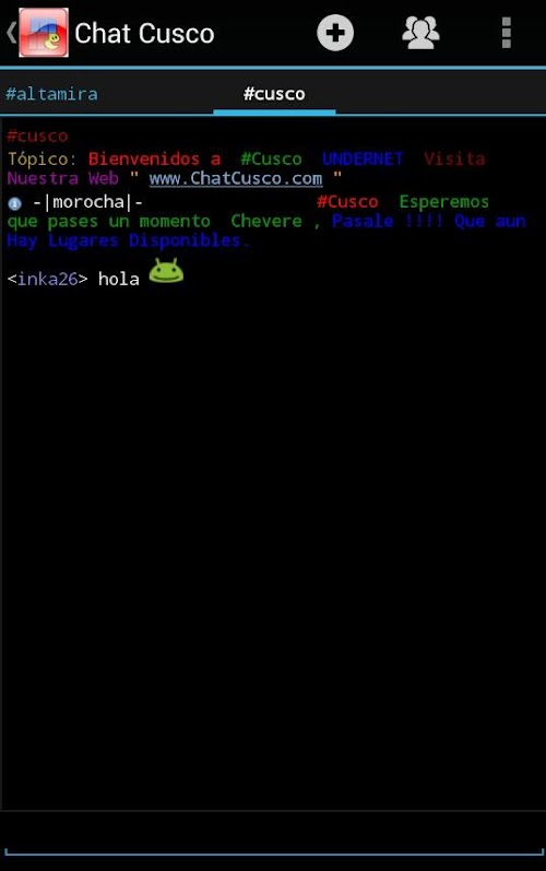basada en Yaaic de Sebastian Kaspari. http://www.yaaic.orgIs is History Between 1998 and 1999 unsuccessfully attempted to register the channel # CUSCO, its main driver harlito, who along with Marqus and Yoel and had previously registered the first two channels of southern extremo.Y was in late 1999 that Roger77 (BoLaSpUnK) records the channel # CUSCO, ahead of the latest drivers. Thus the 18/01/2000, # CUSCO is officially registered with the CService.
