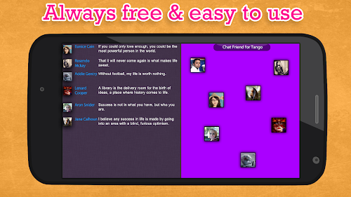Bored, and want to find new friends? Download Chat Friend for Tango if you want to find more Tango friends. Use Chat Friend's rooms to find other people, make new friends, and exchange Tango specific usernames. This is the perfect app to find more friends to add to your Tango friend list. All you need is an internet connection, and you will be able to start meeting more friends today. This app is free to use, and only uses your data, no SMS fees. Chat however you like. This app allows you to control your conversations, so you always decide who you talk. You can choose who you want to talk to, and who you give your Tango username to. Chat Friend, is not endorsed or associated with TangoMe, Inc.