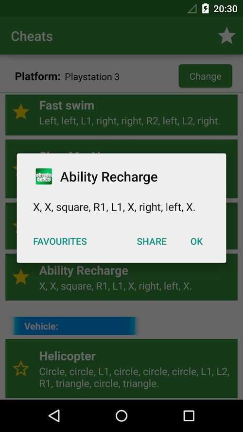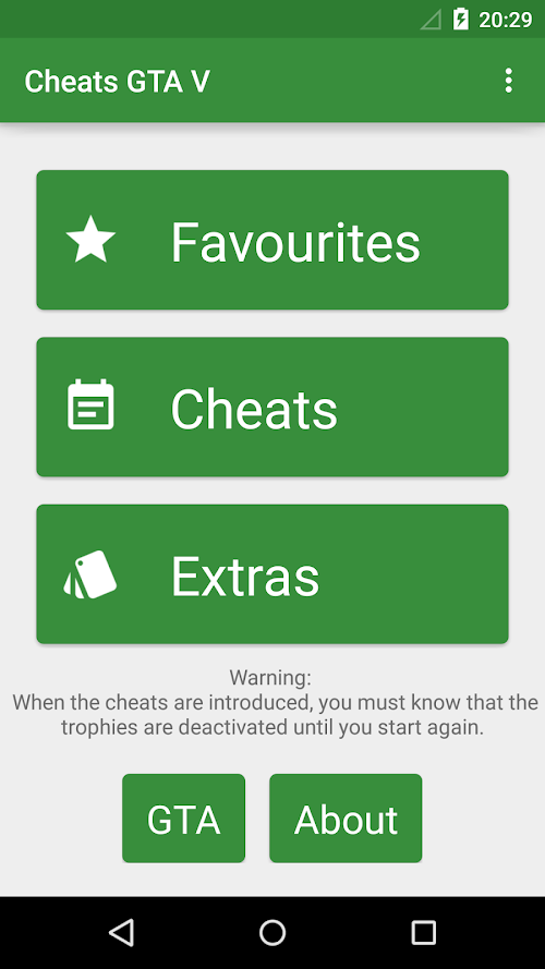 In this app you will find all CHEATS and codes for GTA 5 (GTA V) for PC, Playstation 3, Playstation 4, Xbox 360 and Xbox One. You will also find one button to save your cheats in favourite, and later you will be able to see it very fast.