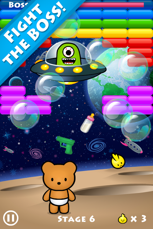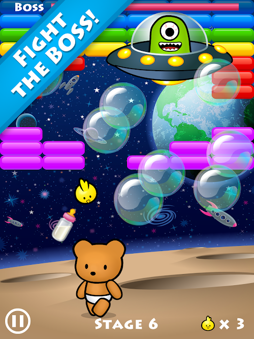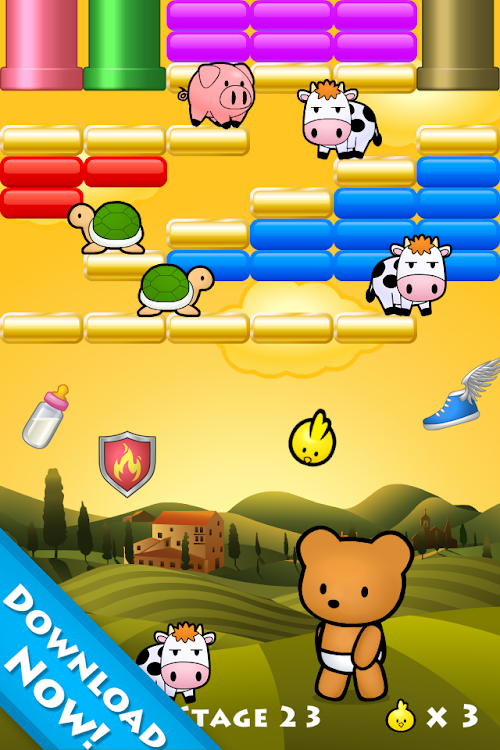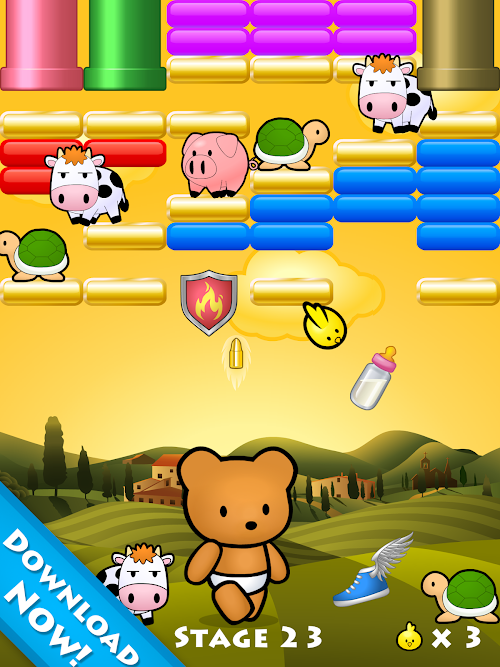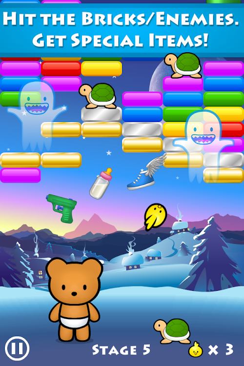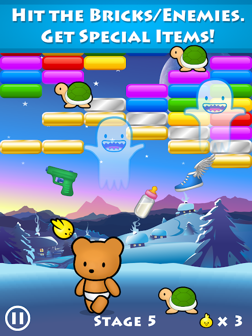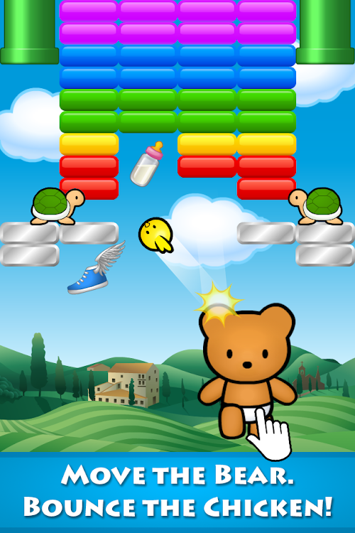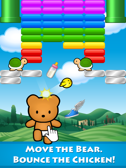 A hilariously fun and original twist to the great classic games. Drag to move the bear and bounce the chicken to destroy all bricks. Swipe up to jump or stomp on the enemies. Some bricks/enemies contain power-up items to help you out. To get maximum score, clear the stage in shortest time with highest combos.