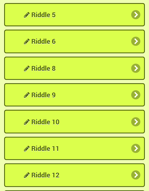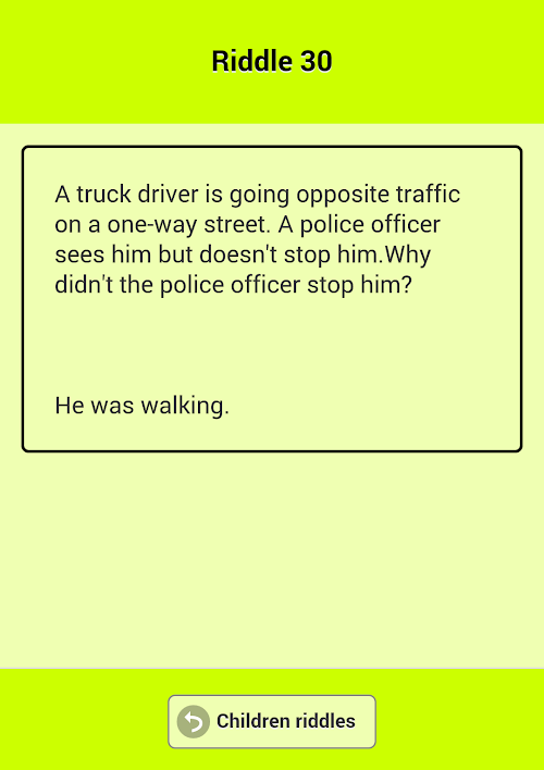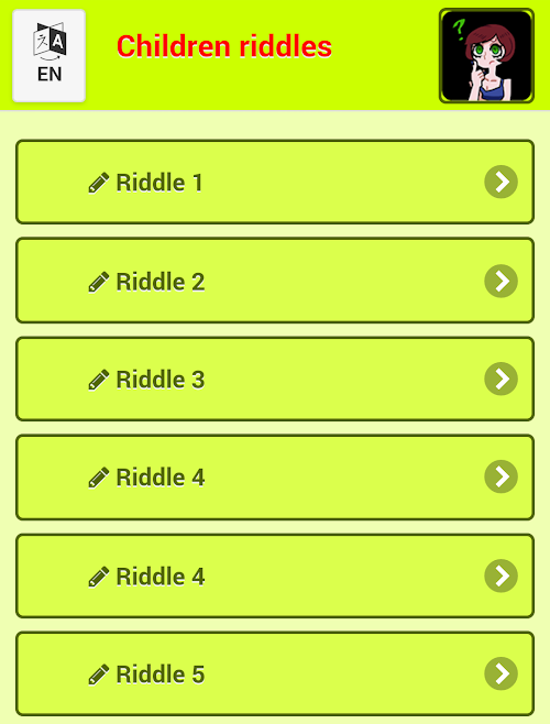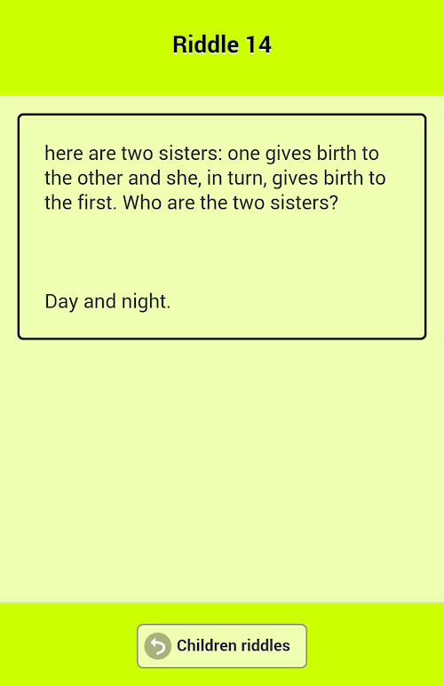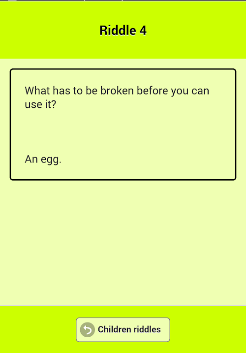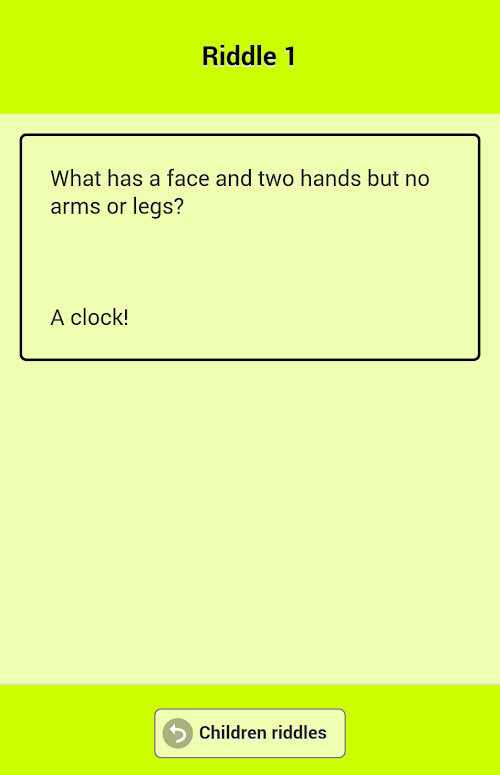 Riddles Children is an application designed to liven up the time parents and children spend together, while the little ones can learn vocabulary and develop your mind. To do this we provide a set of short riddles on various topics (fruit riddles, riddles plant, animal riddles, riddles from home and school, riddles of nature, love riddles ...) with the answers.
