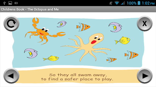 This is a childrens book for young kids to read. It has bright illustrations depicting an octopus and a crab who live in the sea and need to find a safe place to play. Their playground is being taken over by fishermen who have dangerous fishing lines dangling into the ocean where all the fish play.