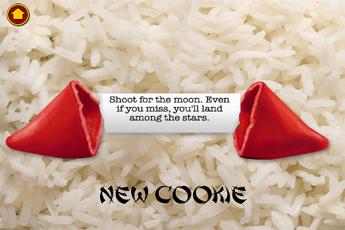 Instructions for Fortune Cookies: Pull apart cookie with fingers. Hear crunch. Voila, fortune revealed! Tap new cookie to start again or tap home to select a different cookie color. Random fortunes displayed after cookie broken in half.