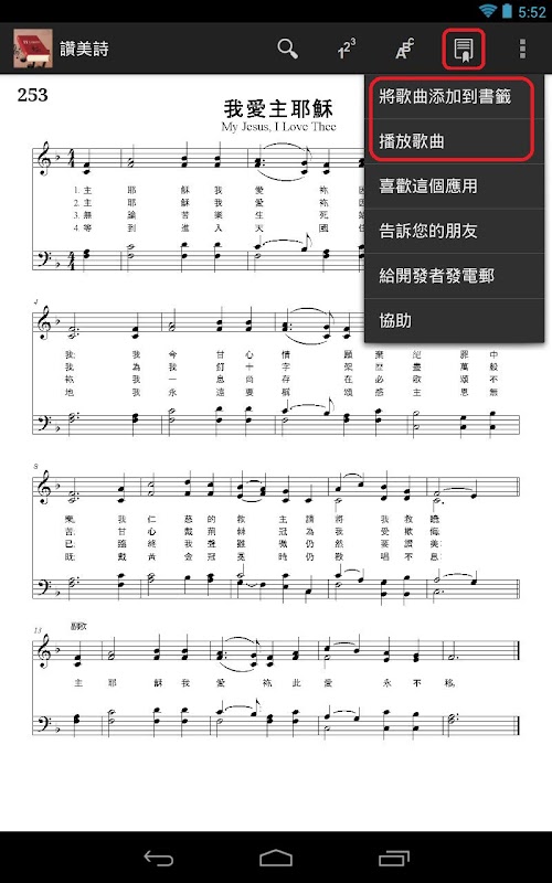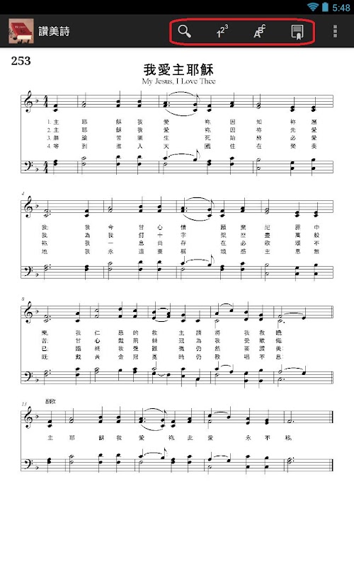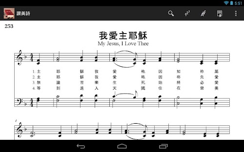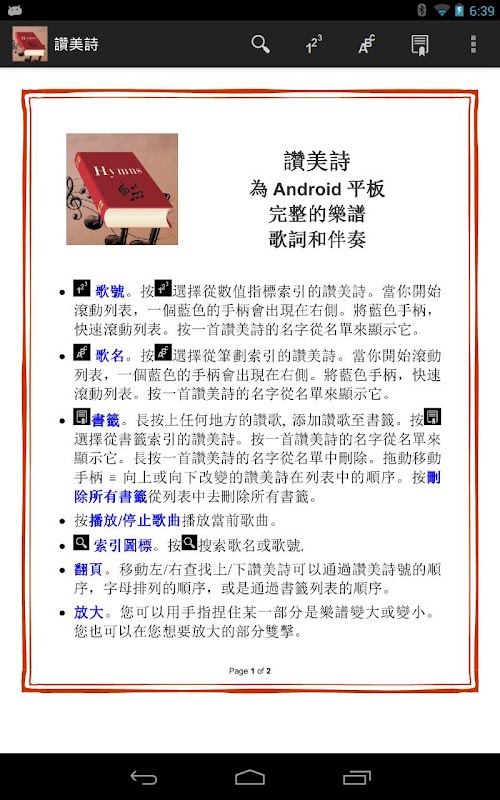 The user interface has a clean look with no ads, and very easy to use. You can quickly and easily find the hymn that you want either by selecting from the alphabetical index of hymn titles, the numerical index of hymn numbers, or your own bookmark list. There is a full featured bookmark list for you to add songs that you need for quick access. Use the search feature to quickly search for words in the title, or just enter a hymn number to jump directly to that hymn. You can also swipe left or right to go to the next or previous song just like turning pages in the printed hymnal. The swipe turning sequence can either be in numerical hymn number order, alphabetical hymn title order, or bookmark list order. Zoom in for larger notes and texts both in portrait or landscape orientations.