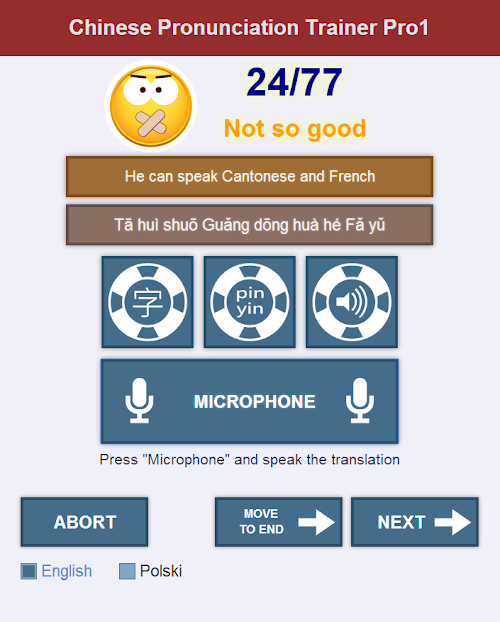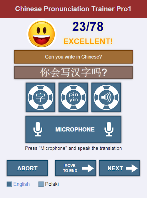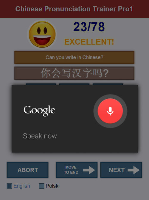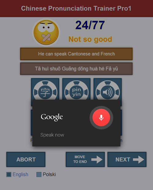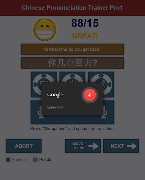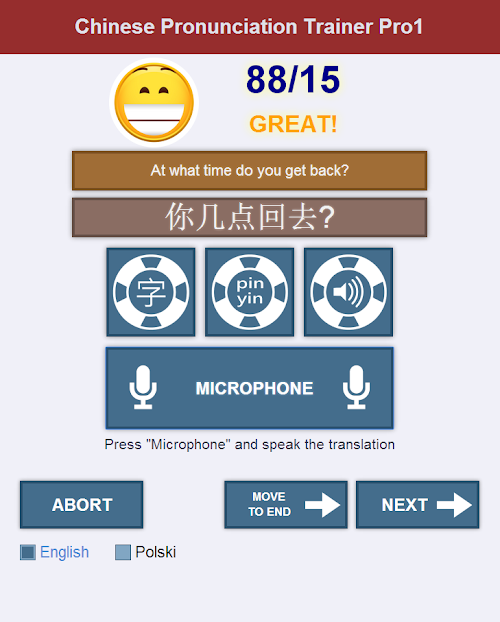 The application verifies the correctness of your speech. Controls the quality of pronunciation of the tones in standard Mandarin.