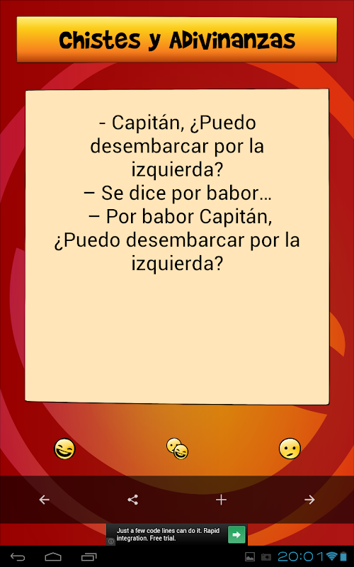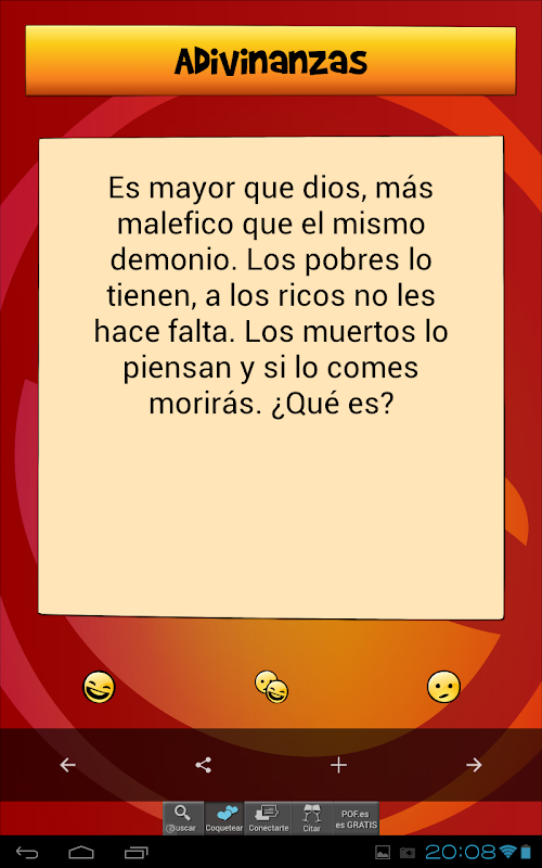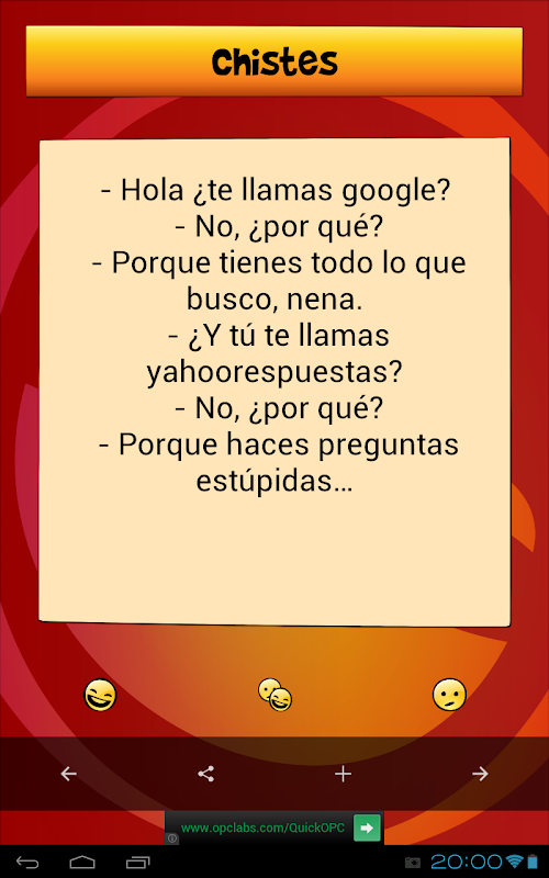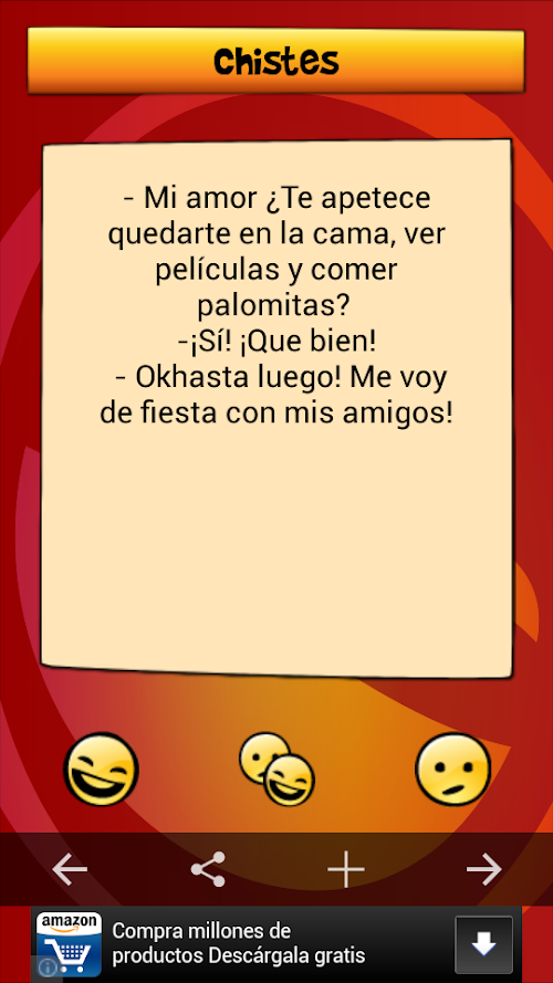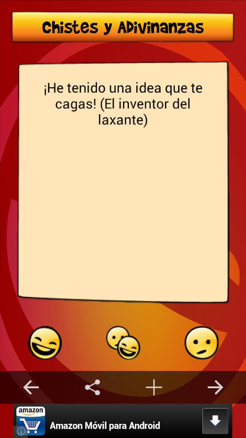 Y porque en la variedad está la diversión, puedes disfrutar de CIENTOS de chistes y adivinanzas y compartirlos con quien quieras a través de Facebook, Twitter ,Tuenti, WhatsApp, Hangout, Skype, Gmail, Outlook, SkyDrive, Google Drive, SMS, etc.