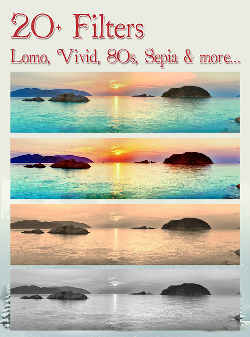 - Filters: vivid, lomo, sketch, cartoon, posterize, 80's, sepia, retro and many more.