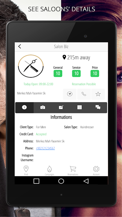 If you are a client; you can find hairdressers or any care/beauty/wellness salons around you with ratings, addresses, services, prices and comments, and make a reservation instantly the salon you would like to! You can also see salon address, navigate to salon or just call!