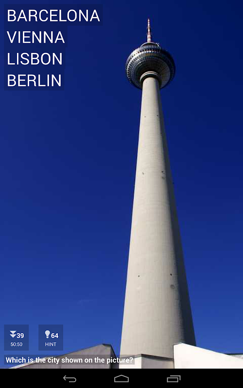 Guess correctly 7 out of the 10 landmarks in Europe to open the next level in this guess city game. Use your hint bonus points to get a clue about the beautiful photo you see if you cannot recognize it immediately. Every 3 correctly guessed photos give you an additional hint point. You can also use a 50:50 bonus in order to get rid of two wrong answers for the picture. You get an additional 50:50 bonus point for every 5 correctly identified photos. Initially the famous pictures of tourist landmarks in the beautiful cities you see will be easy to guess, but as you progress in this picture quiz they will become harder to recognize.