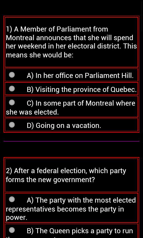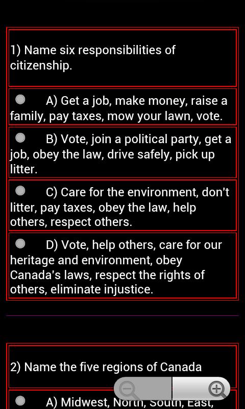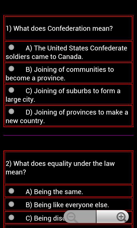 This application is handy for studying and well preparing yourself for the Canadian Citizenship Test. There are 12 groups of 12 questions multiple choices drawn randomly from the resource book "Discover Canada”, and provinces information to enable the candidates to practice repeatedly at anytime anywhere.