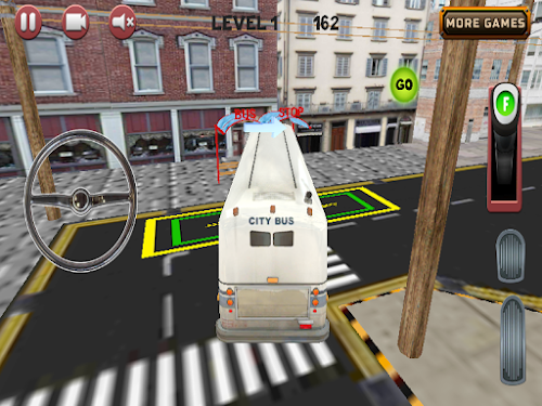 City Bus Parking is a bus parking game that will put your skills to the test over driving, and that requires a lot of precision and attention. You need to park the bus in several places, so watch all the obstacles that you encounter, and make sure that everyone on the bus to get safely to the parking lot. You have to drive very carefully, without getting hit by obstacles; if you do this you have to start from the beginning, and I do not think you would like this. However, this game has a limit. And you have to hurry, to get as fast but also safe. Seconds that you remain at the current level, it will add to the next level, to have as much time to park the bus right.