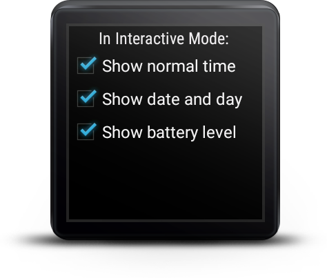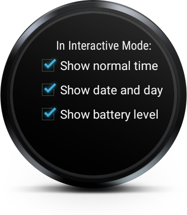 The wear application will display the current encoded time in Ambient mode. In Interactive mode, user can choose to display normal time, date and battery level