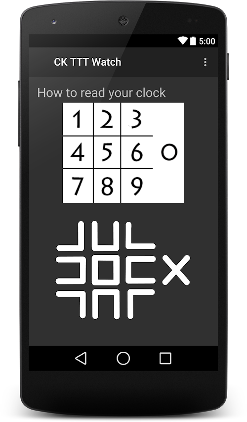 A watch face will display your HH:MM in Tic-Tac-Toe Cipher format on your Android Wear device.