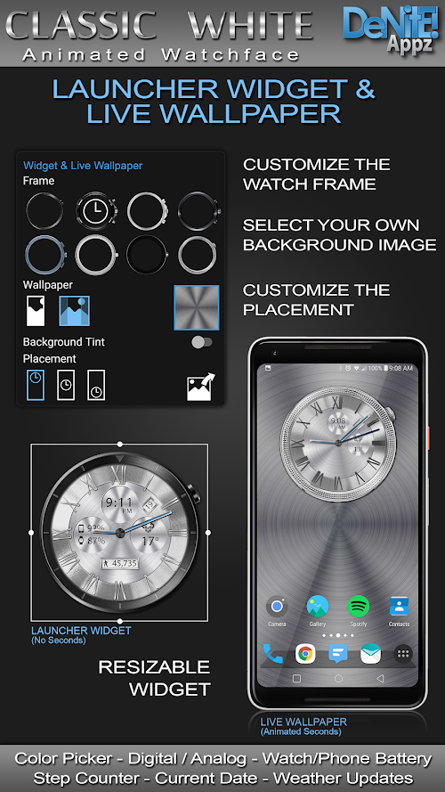 This completely customizable interactive HD Wear OS Watch Face, Clock Widget & Live Wallpaper brings a classic elegance to your wrist and Launcher. Features include custom complications, battery levels, weather conditions, step counter, color picker & date information. A settings app will also be installed on your mobile device to configure the watch face for any look you desire. Select any color and create a completely custom look for yourself! Don't have a Wear OS watch? No Problem! You can use the clock widget or Live Wallpaper on your launcher!