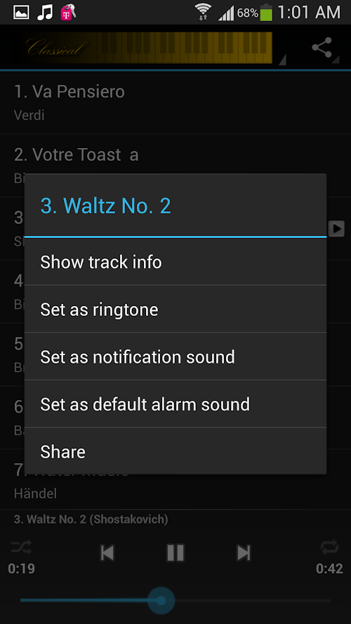 Keep your finger on any title to set as a ringtone, notification sound or alarm sound.