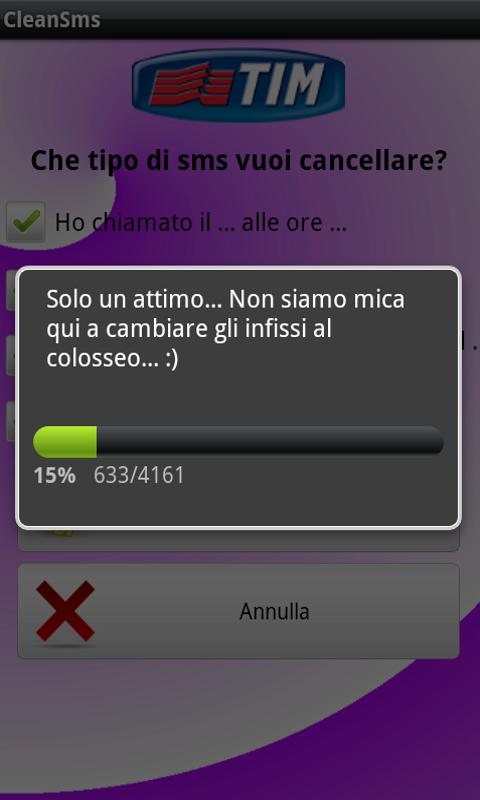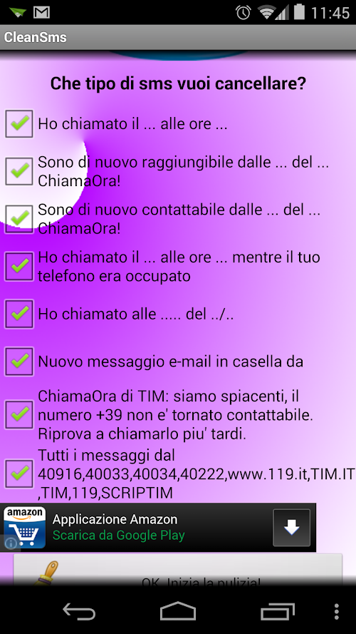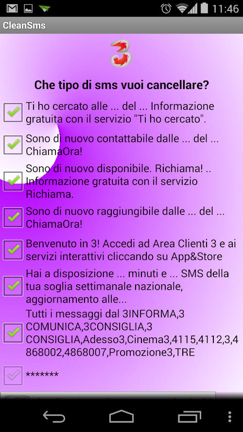 ... E ALTRI!!!!Do you want to delete the sms boring your operators? Type "Have you received a call from .." or "I again contacted .. ChiamaOra!" That add up in your phonebook SMS? Clean SMS automatically cleans these types of messages in a fully automatic way from your rubrica.E 'available to operators TIM, VODAFONE, WIND, stepmother, THREE ITEMS OF FURNITURE. If you want the program to erase other messages, contact me, it will be a pleasure to implement your request.