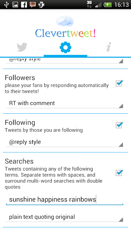 Automate your tweeting - use Cleverbot's Artificial Intelligence! Clevertweet runs in the background on your device, posting tweets to your friends, followers and more.
